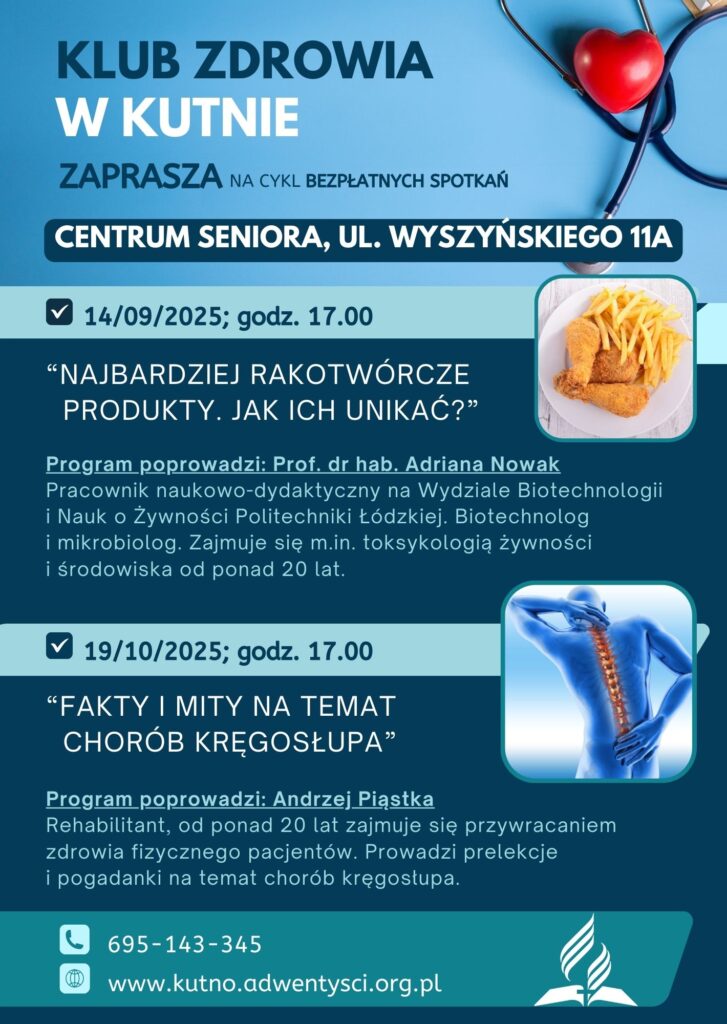 Serdecznie zapraszamy do uczestnictwa w kolejnym spotkaniu Klubu Zdrowia „Zdrowie na nowo” w Kutnie, które odbędzie się 19 października (niedziela) o godzinie 17.00 w Centrum Seniora przy ul. Wyszyńskiego 11A.