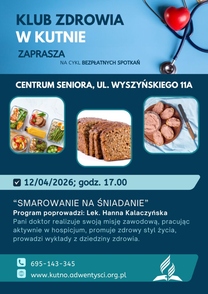 Serdecznie zapraszamy do uczestnictwa w kolejnym spotkaniu Klubu Zdrowia „Zdrowie na nowo” w Kutnie, które odbędzie się 12 kwietnia (niedziela) o godzinie 17.00 w Centrum Seniora, przy ul. Wyszyńskiego 11A.