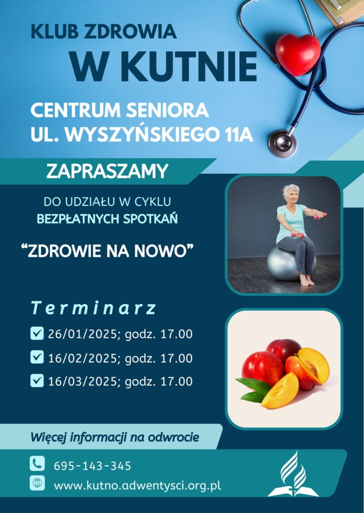 Serdecznie zapraszamy do uczestnictwa w kolejnym spotkaniu Klubu Zdrowia „Zdrowie na nowo” w Kutnie, które odbędzie się 18 stycznia (niedziela) o godzinie 17.00 w Centrum Seniora przy ul. Wyszyńskiego 11A.