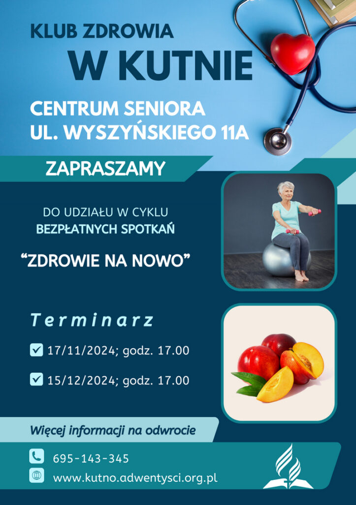Serdecznie zapraszamy do uczestnictwa w kolejnym spotkaniu Klubu Zdrowia „Zdrowie na nowo” w Kutnie, które odbędzie się 20 października (niedziela) o godzinie 17.00 w Centrum Seniora przy ul. Wyszyńskiego 11A.