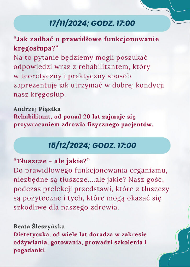 Prelekcje w I kwartale 2025r. poprowadzą: zielarz, magistrant psychologii klinicznej i rehabilitant. Uczestnictwo w spotkaniach jest bezpłatne.