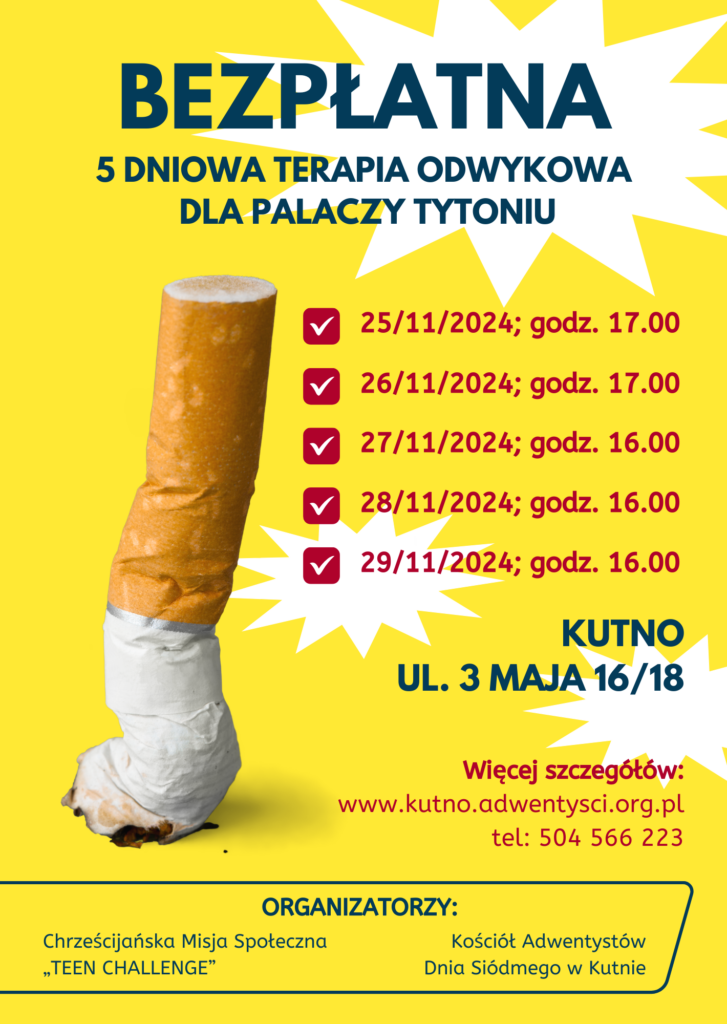 Wychodząc naprzeciw „palaczom tytoniu”, zapraszamy do udziału w BEZPŁATNYM, 5 dniowym programie odwykowym „Rzucam Palenie”, który odbędzie się w Kutnie w najbliższych dniach. Skuteczność tego programu została dowiedziona ponad 40 letnim doświadczeniem. Kuracja trwająca po ok. 1-2 godziny przez 5 dni pomaga trwale rozstać się z uzależnieniem. Program poprowadzi Jan Gławęda. Zapraszamy do udziału.